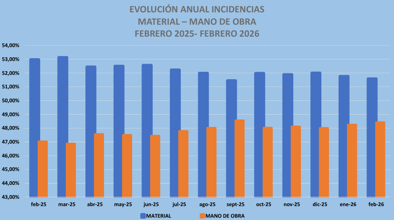 En términos interanuales, el índice muestra una variación del 17,96% comparado con febrero de 2025. Un dato curioso que destacó Andrada es que los materiales han subido un 14,52% en el último año, una cifra que se sitúa por debajo de la inflación general, mientras que la mano de obra escaló un 21,87% en el mismo periodo.