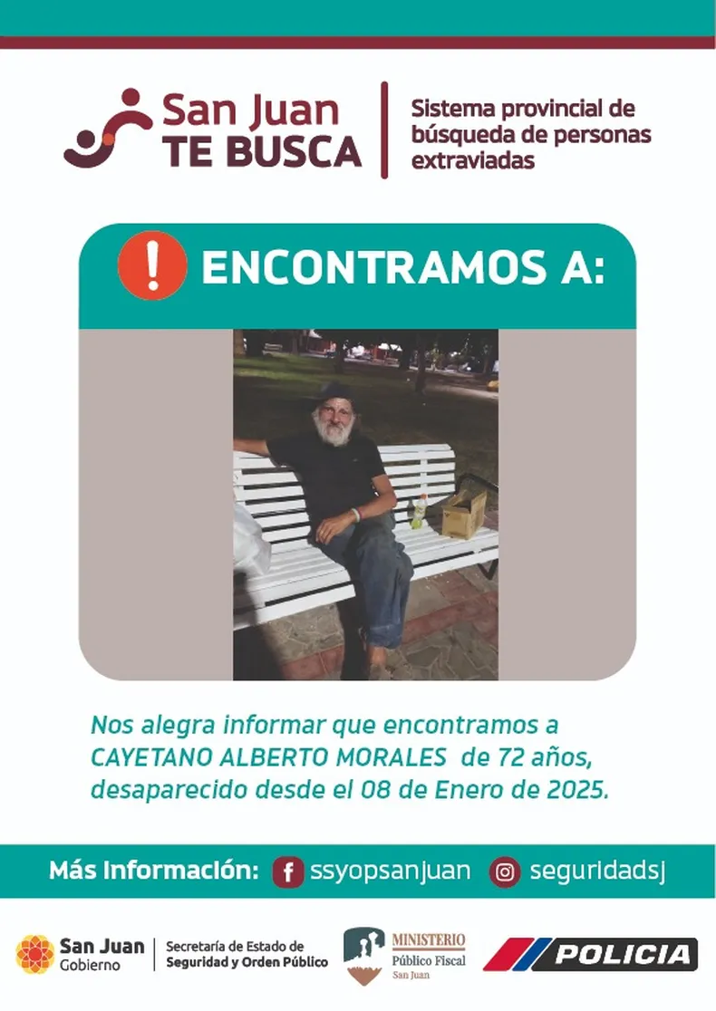 Este lunes por la mañana, la Policía de San Juan confirmó que Cayetano Alberto Morales, un hombre de 74 años conocido por sus reiteradas desapariciones, fue hallado con vida tras varios días de búsqueda. El operativo se activó luego de una nueva alerta por su paradero y se desarrolló bajo el protocolo “San Juan Te Busca”, con intervención de distintas áreas policiales. Según fuentes oficiales, no se brindaron detalles sobre su estado de salud ni sobre las circunstancias en las que fue encontrado.