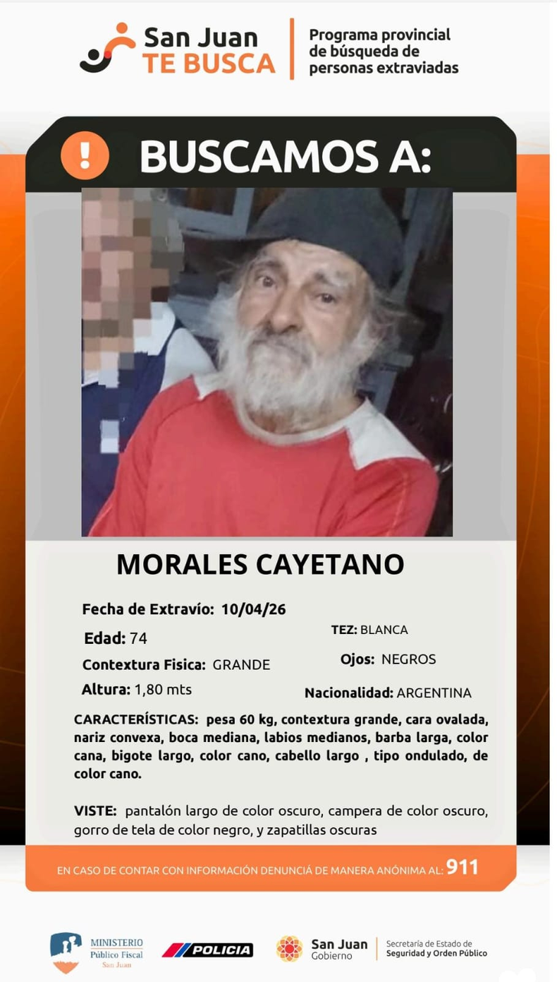 Por otro lado, la preocupación crece en torno a Cayetano Morales, desaparecido desde el 10 de abril. Debido a su edad, 74 años, las autoridades han manifestado una especial alarma. Morales es de contextura grande, mide cerca de 1,80 metros y se caracteriza por tener tez blanca, ojos negros y una abundante barba y cabello canosos, ambos de largo considerable. Su vestimenta consistía en pantalón, campera y zapatillas oscuras, complementadas con un gorro negro.
