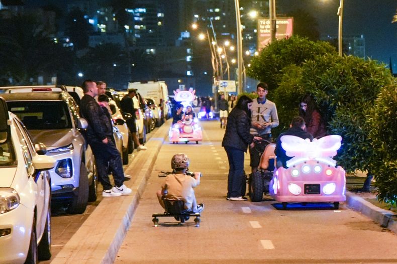 La ciclovía que corre paralela a la costa también se mantiene llena de actividad pasada la noche. Niños, adolescentes y adultos aprovechan para pasear en bicicleta, monopatines, autos eléctricos con luces y otros vehículos recreativos, creando un paisaje dinámico y familiar bajo la luz de las farolas y el reflejo del mar.