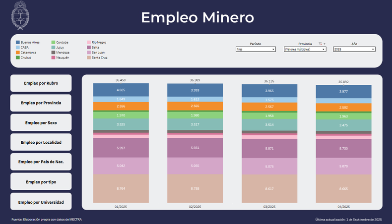 San Juan también se destacó en la generación de empleo dentro del sector. Hasta abril de 2025, la provincia registró 5.070 puestos de trabajo vinculados a la actividad minera, ubicándose nuevamente en el tercer lugar del ranking nacional, superada únicamente por Santa Cruz (8.665) y Salta (5.730).