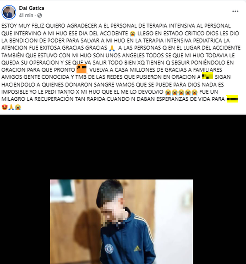 En otro posteo, publicado también este viernes por la tarde, la madre volvió a agradecer con un mensaje lleno de fe y gratitud: “Estoy muy feliz, quiero agradecer al personal de Terapia Intensiva, al personal que intervino a mi hijo ese día del accidente. Llegó en estado crítico y Dios les dio la bendición de poder salvarlo. La atención fue exitosa. Gracias a las personas que estuvieron con mi hijo en el lugar del accidente, son unos ángeles. Sé que todavía le queda su operación, pero tengo fe en que todo saldrá bien, porque para Dios nada es imposible. Fue un milagro la recuperación tan rápida, cuando no daban esperanzas de vida para él”.