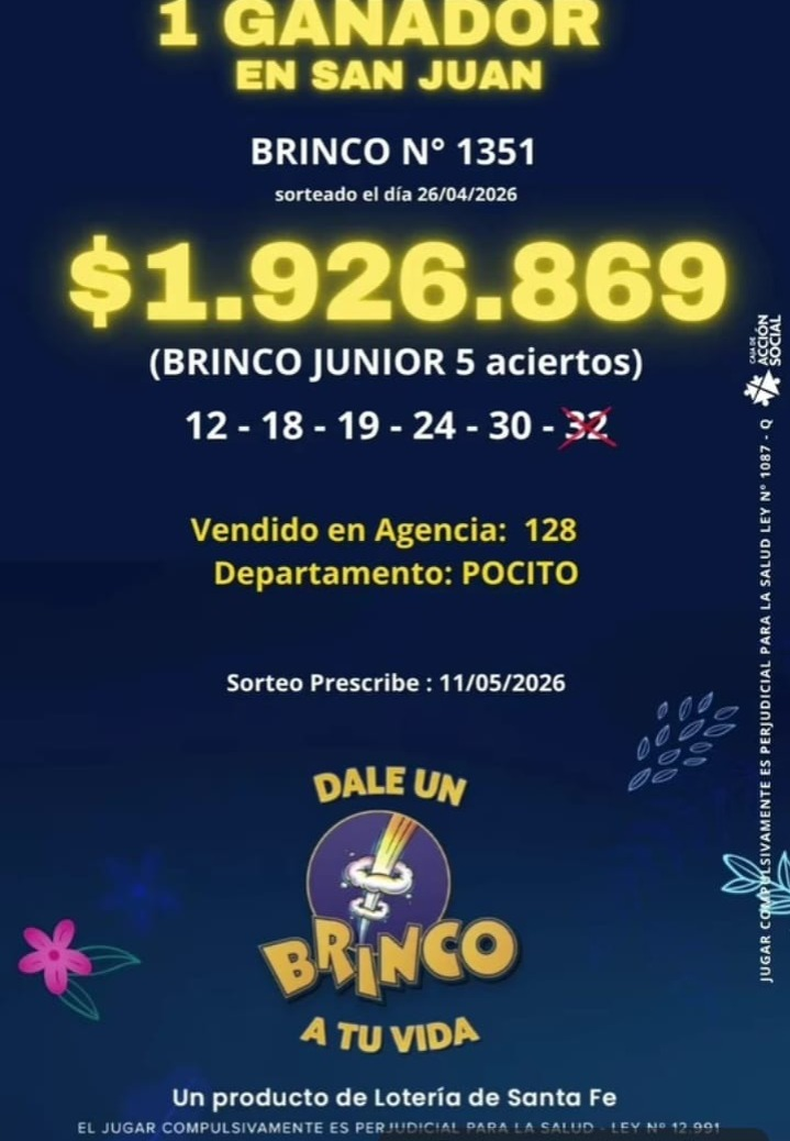Por otro lado, en el sorteo del Brinco, otro apostador de San Juan obtuvo un premio de $1.926.889 tras alcanzar cinco aciertos en la modalidad Brinco Junior, con los números 12, 18, 19, 24 y 30, quedándose muy cerca del pleno, ya que le faltó únicamente el número 32. En este caso, el cartón fue vendido en la Agencia 128 del departamento Pocito, y el ganador podrá cobrar su premio hasta el 11 de mayo.