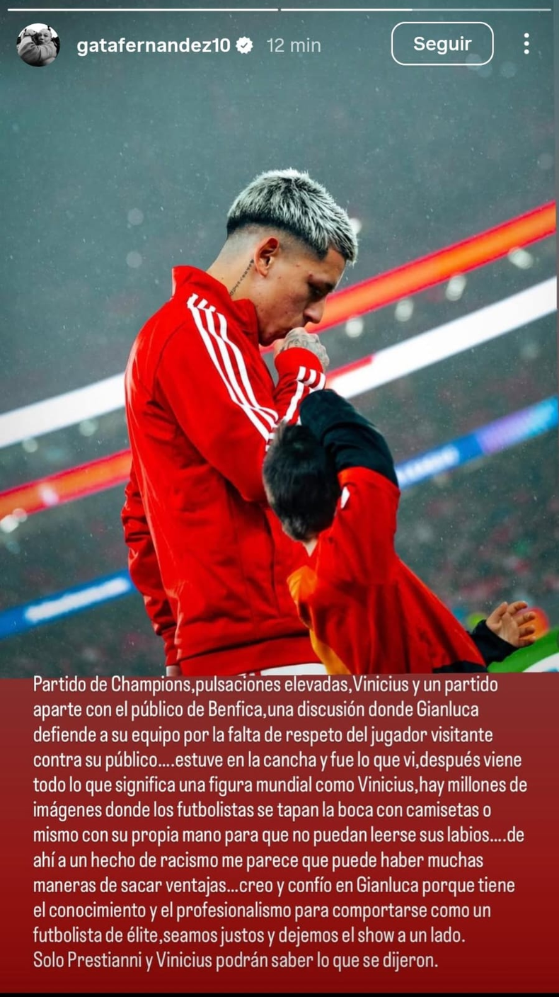 “Partido de Champions, pulsaciones elevadas, Vinicius y un partido aparte con el público de Benfica. Una discusión donde Gianluca defiende a su equipo por la falta de respeto a un jugador visitante contra su público… estuve en la cancha y fue lo que vi”, comenzó relantando el ex delantero de River y Estudiantes.