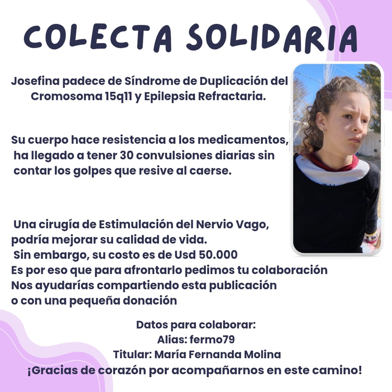 Una familia sanjuanina lanzó un urgente pedido de ayuda para Josefina, una adolescente de 16 años que padece síndrome de duplicación del cromosoma 15q11 y epilepsia refractaria, una condición que le provoca convulsiones constantes y pone en riesgo su integridad física.